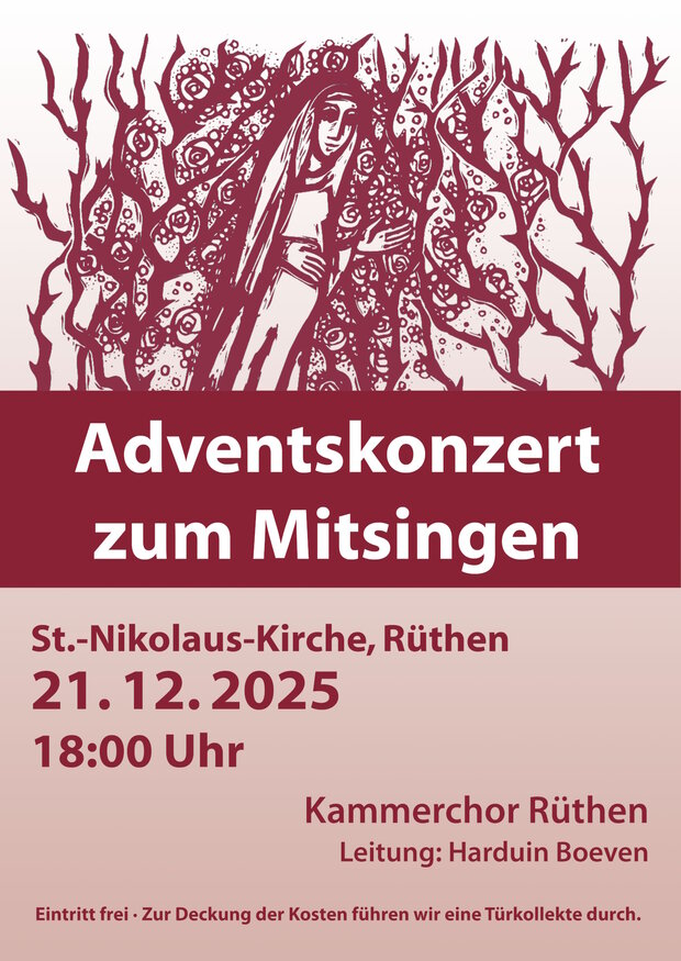 Am Sonntag, dem 21. Dezember 2025 (4. Advent) lädt der Kammerchor Rüthen zu einem Adventskonzert zum Mitsingen ein. Neben dem gemeinsamen, orgelbegleiteten Singen beliebter Advents-, Nikolaus- und Weihnachtslieder wird der Kammerchor auch einige konzertante Stücke aus dem weihnachtlichen Repertoire zu Gehör bringen. Auf dem Programm stehen Auszüge aus dem „Messias“ von Georg Friedrich Händel und „Panis Angelicus“ von César Franck. Dazu werden stimmungsvolle Textbeiträge vorgetragen. Die Veranstaltung beginnt um 18:00 Uhr in der Rüthener Nikolauskirche. Der Eintritt ist frei.